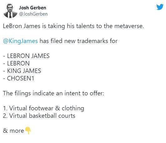 将天赋带到元宇宙!詹姆斯注册“国王”等个人商标 进军热门领域