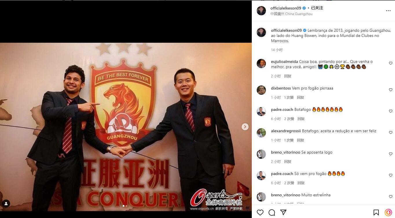 北京时间3月11日消息,近日,国足归化球员艾克森在社交媒体上晒出了两张照片,并配文:2013年的记忆,效力于广州,与黄博文一起前往摩洛哥参加世俱杯。