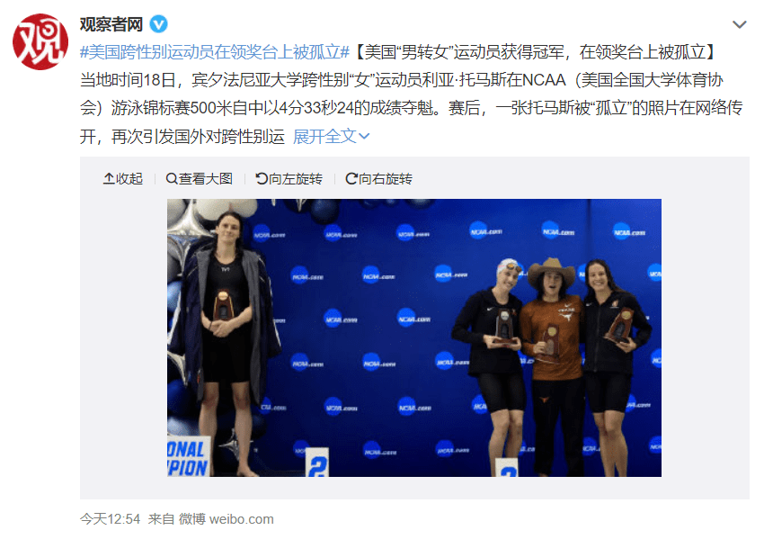 美国22岁变性选手夺冠,遭对手集体孤立!明确表示将参加巴黎奥运