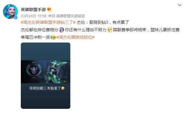 配图被《英雄联盟手游》官方发在了微博上,结果底下一堆网友在催新歌,“累了出首歌来听听”、“累了就去写歌”、“传下去 新专辑《钻石三》”等等。
