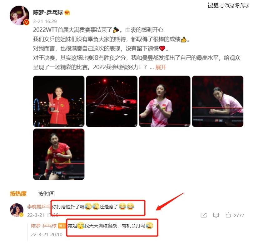 陈梦拿到冠军也得到了山东队和国家队的师姐,同时也是大满贯得主李晓霞的隔空祝福,李晓霞隔空喊话陈梦,并且调侃陈梦是否打了瘦脸针,还约战陈梦,并且说道: