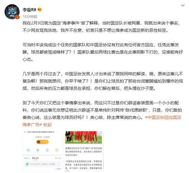 北京时间4月7日消息,昨晚足协发言人针对“海参广告”等涉及国家队赞助商的传言进行了回应,表示国家队队员适当配合参与赞助商宣传是合理商业要求。但对于这个回应时机,媒体人李璇在个人社交媒体上进行了评析。