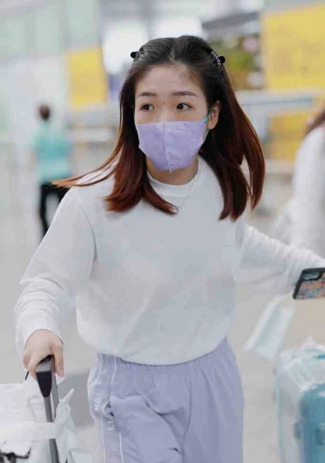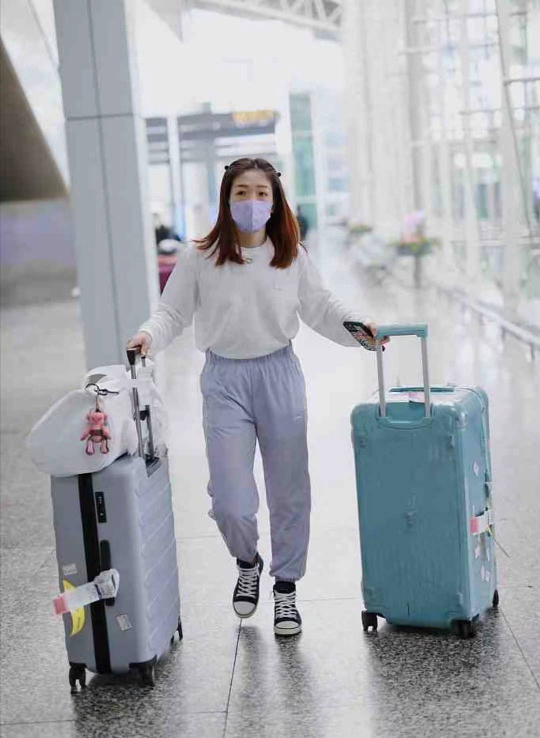 刘诗雯一头披肩发,戴着紫色的口罩。比较瘦弱的体格,却拉着2个大大的拉杆箱,而一个白色的背包上,还有一个小熊的玩偶配饰,显得非常可爱。
