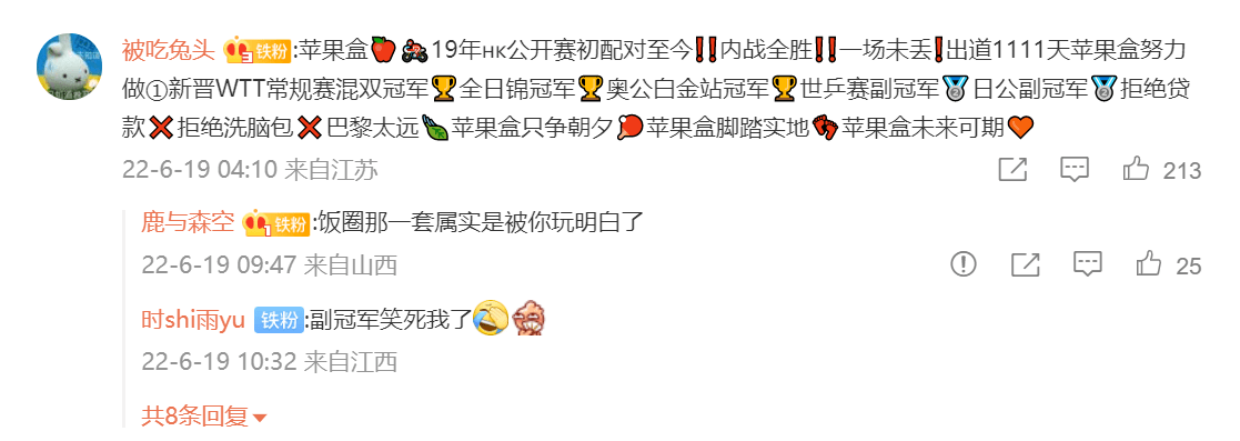 这位名叫“被吃兔头”的网友或许是张本智和、早田希娜的粉丝,不遗余力地夸奖他们二人,也是可以理解的!但问题是,这位名叫“被吃兔头”的网友还整出个“副冠军”,就实在令人难以接受了。查阅资料得知,张本智和/早田希娜曾在2021年世乒赛混双项目中夺得亚军,也就是说,这位网友口中所谓的“副冠军”,其实就是亚军。对此,有不少网友在评论区表达了自己的看法。