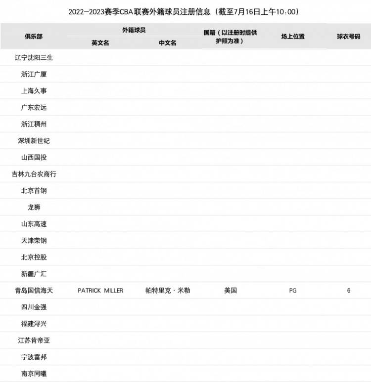 7月16日消息,CBA官网更新,青岛男篮为外援帕特里克-米勒完成注册,他新赛季将身穿6号球衣。米勒是2022-23赛季CBA首位完成注册的外援。