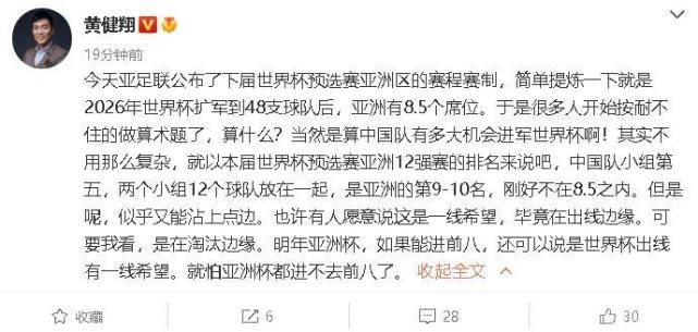 著名体育评论员黄健翔在社交媒体发文,谈了他对世界杯亚预赛扩军后新赛制的看法。在黄健翔老师看来,国足不需要去做复杂的算术题,国足想要冲击2026世界杯并不容易,球队处在“淘汰的边缘”。