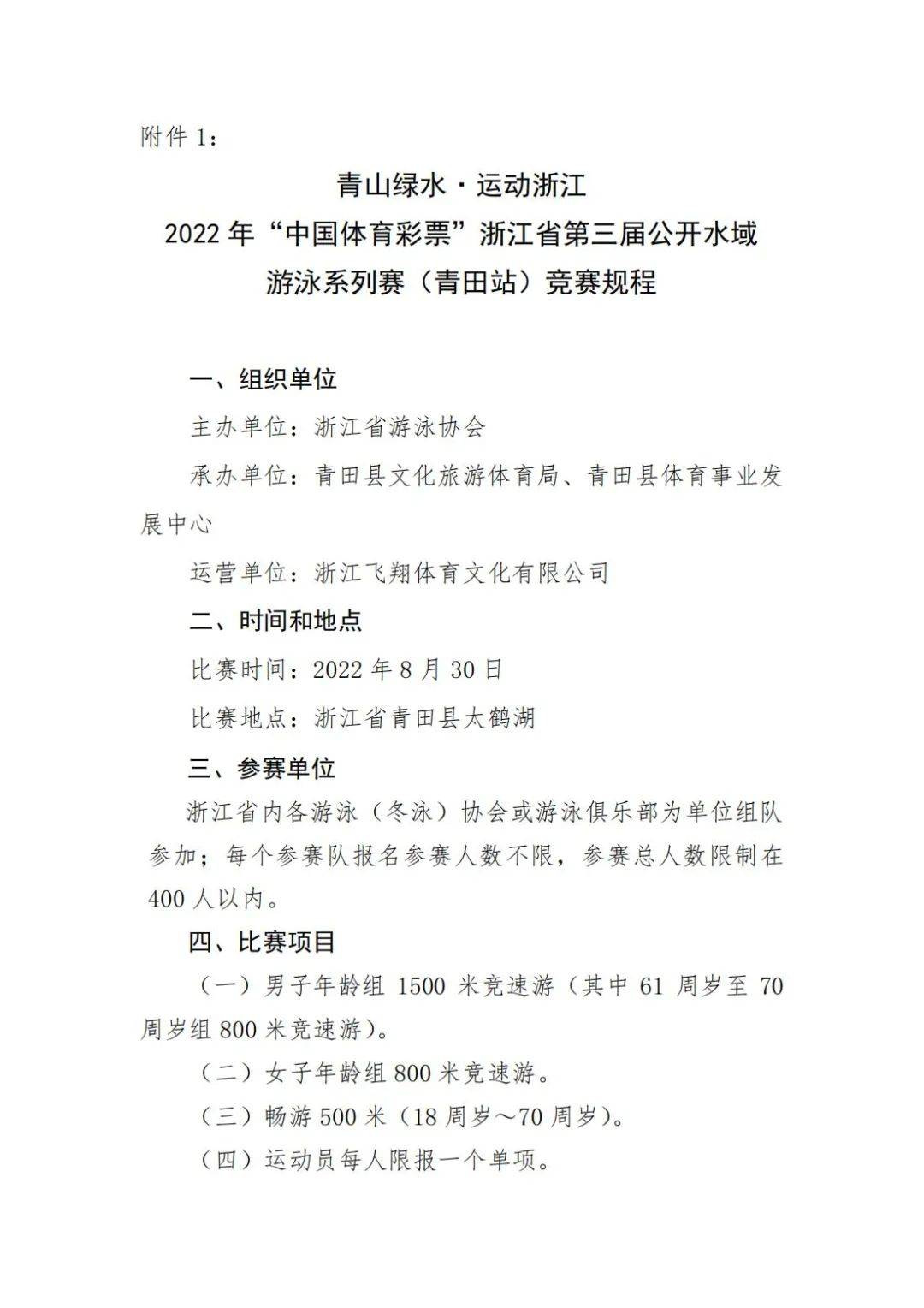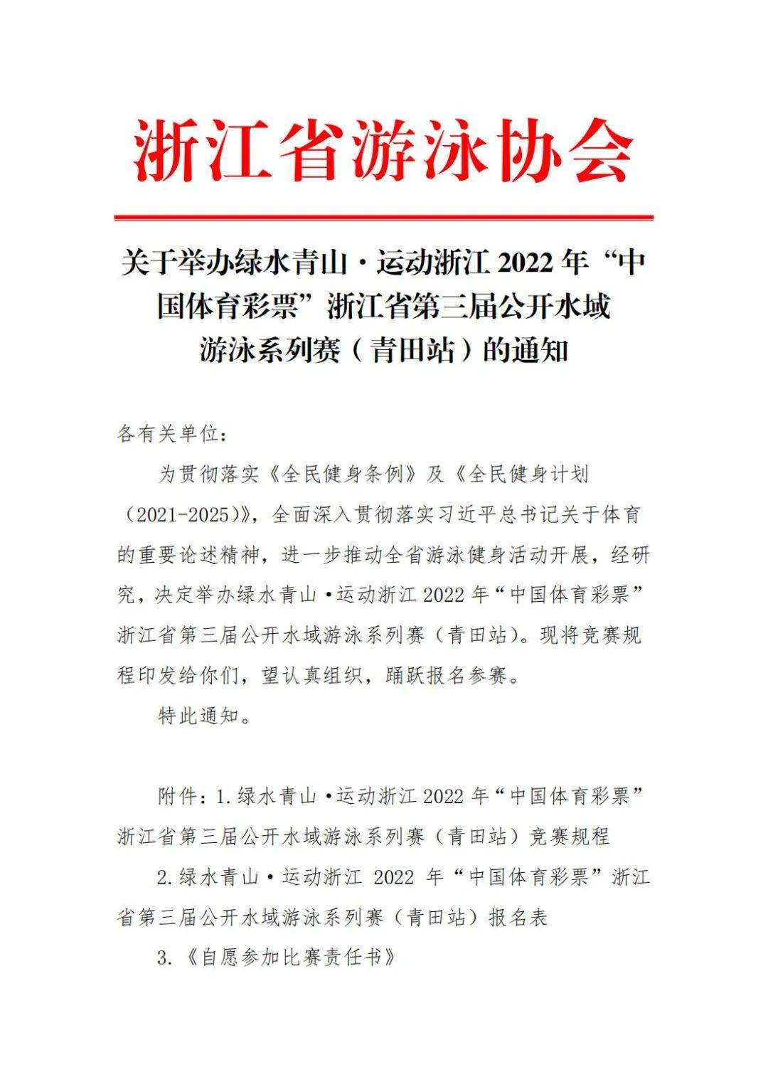 浙江省游泳协会关于举办绿水青山·运动浙江2022年“中国体育彩票”浙江省第三届公开水域游泳系列赛(青田站)的通知