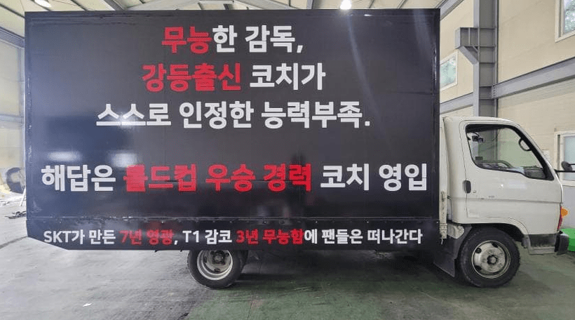 这不是T1战队的粉丝第一次驾驶卡车,在自家战队的大楼门前进行抗议了,看起来,这次粉丝们又筹集了十几万韩元。而且,他们是在选手们前往LOL PARK之前就已经驾车到楼下,还一路开到了LOL PARK附近的公园,所以T1战队的选手们是知道这件事情。但教练和选手并没有因此受到影响,他们在晚上的比赛中,以2-0击败了HLE战队,取得了本赛季的第13场胜利。
