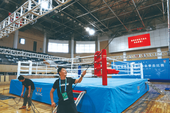 7月25日上午,市体育馆门口宣传展板上,“浙江省第十七届运动会拳击比赛”几个大字醒目,场馆内的拳击舞台已搭建完成。“我们将在场馆布置、电力保障、安全预案、交通出行等方面做足准备,保障拳击比赛顺利进行。”市体育馆馆长方毅说。