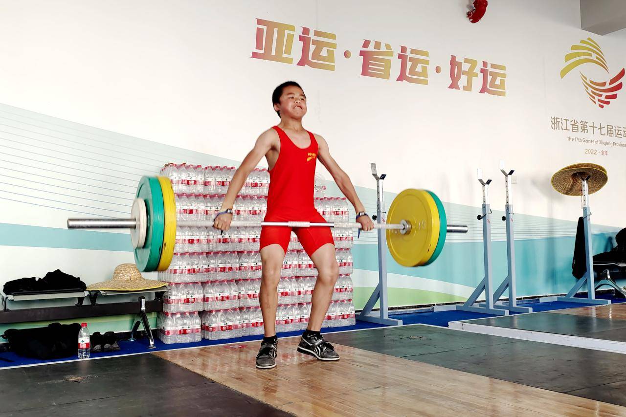 近日,金华市举重代表队30多名运动员在新城中学举重馆紧张训练。总教练洪黎明介绍,举重作为省运会一大重点项目,十分引人关注,金华代表队将全力备战、力争佳绩。图为13岁的颜薛庆正在训练,他是金华代表队年龄最小的队员,第一次参加大型比赛。