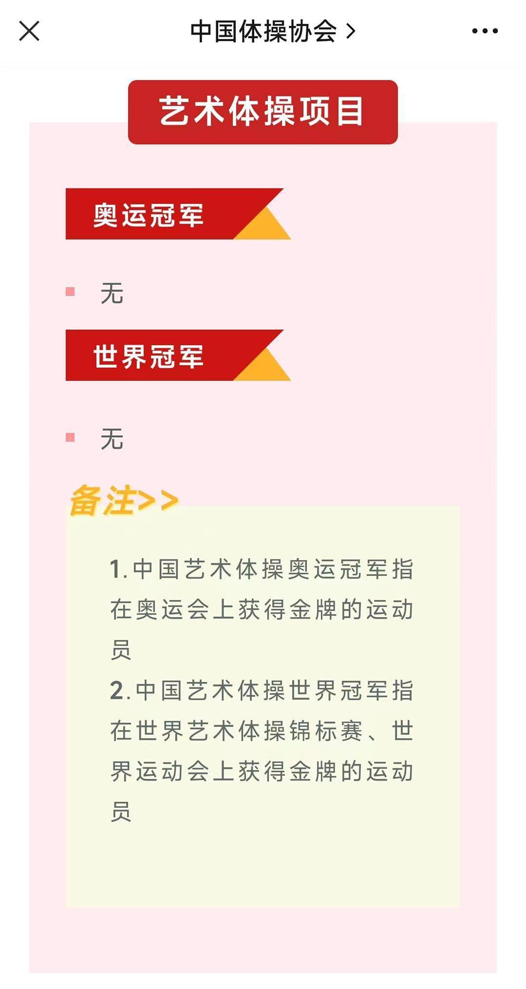 这份名单看似是公布中国体操、中国蹦床和中国艺术体操三大领域的奥运冠军和世界冠军,但重点则是首次向公众说明,在艺术体操领域中,中国目前是没有任何奥运冠军和世界冠军的
