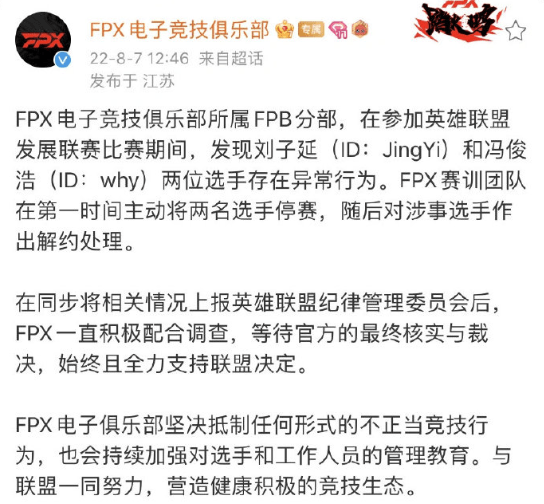 8月7日,FPX官方微博发布一则公告,宣布FPX电子竞技俱乐部所属FPB分部,在参加英雄联盟发展联赛比赛期间,发现刘子延(ID:JingYi)和冯俊号(ID:Why)两位选手存在异常行为。FPX赛训团队在第一时间主动将两名选手停赛,随后对涉事选手作出解约处理。