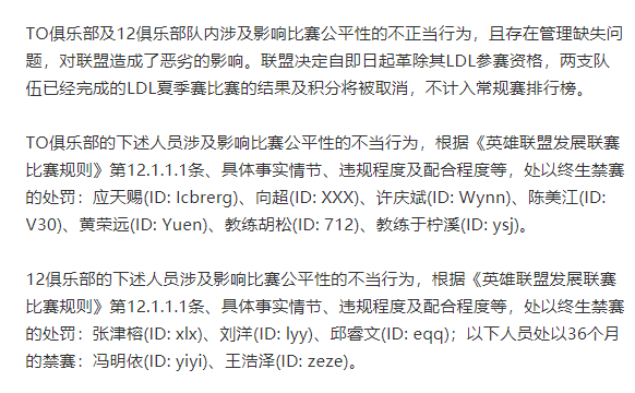 紧接着,英雄联盟发展联赛官方发布近期针对2022LDL反假赌赛整顿公告。公告内对TO与12两个俱乐部的部分选手、教练、经理处以终身禁赛处罚。