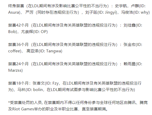 另外,对于在LDL期间有涉及有关英雄联盟的违规投注行为的选手,视情况来进行禁赛18个月以上,42个月以下处罚。