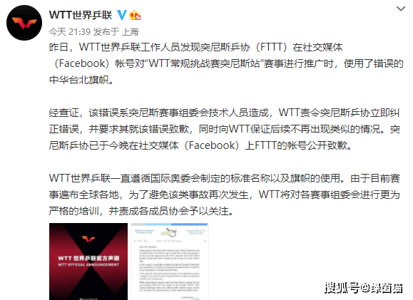 WTT世界乒联正式道歉,他们在社交媒体上表示使用失误的中国台北的旗帜,原因是突尼斯赛事组委会技术人员造成,WTT世界乒联已经责令突尼斯乒协立即纠正错误,并要求针对这一错误进行道歉。WTT世界乒联表示,保证后续不再出现类似的情况。