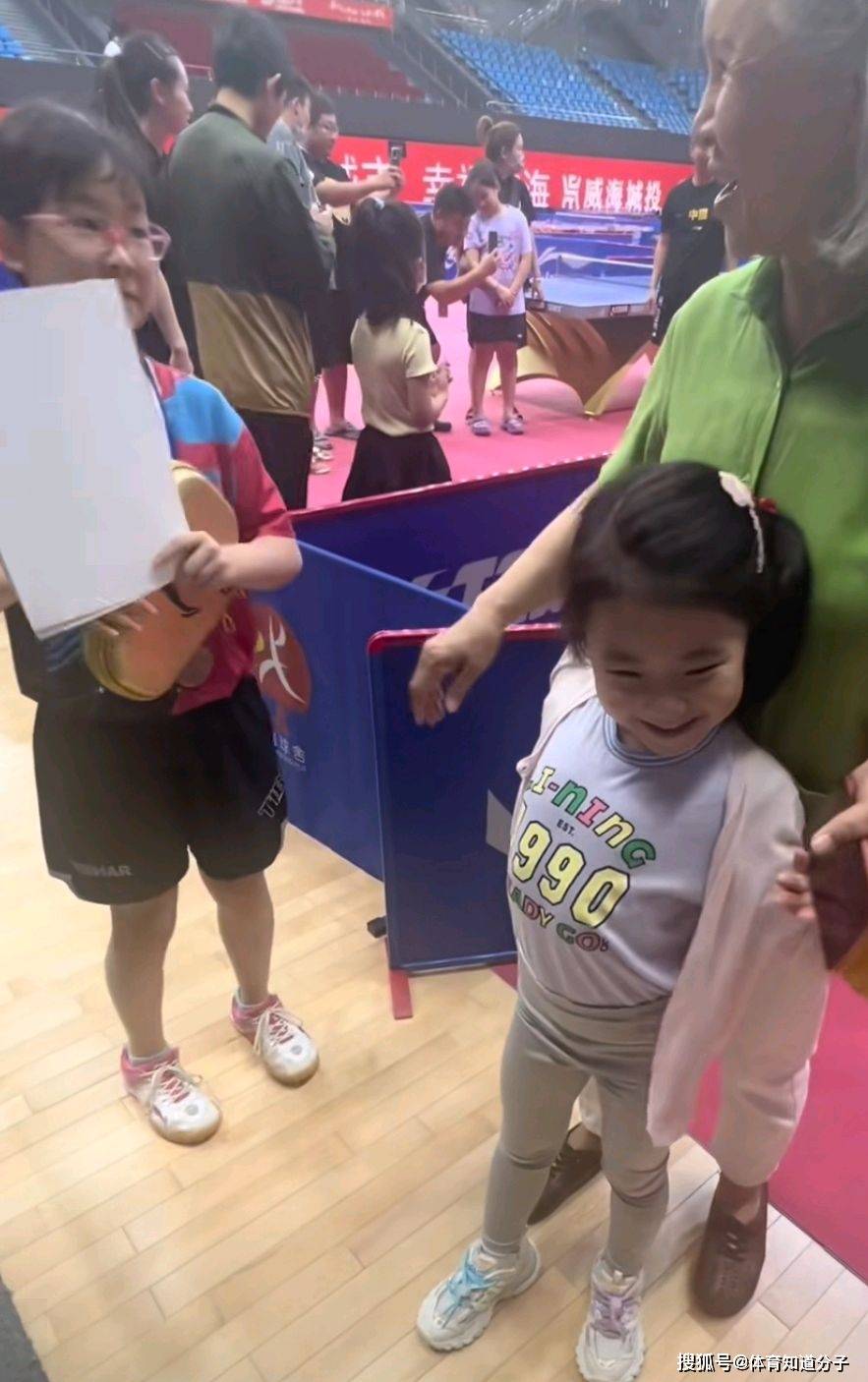 笑笑除了自己打乒乓球以外,也非常关注中国乒坛的动向。近日,在国少选拔赛现场,笑笑前来关注小姐姐们的比赛,一位获得了国少队证书的小队员主动要求和笑笑合影,还夸笑笑球打得好。旁边的人调侃笑笑已经是“小明星”了。面对大家的关注,笑笑自己倒是很不好意思,躲在姥姥的怀里害羞,她居然撒起娇来。
