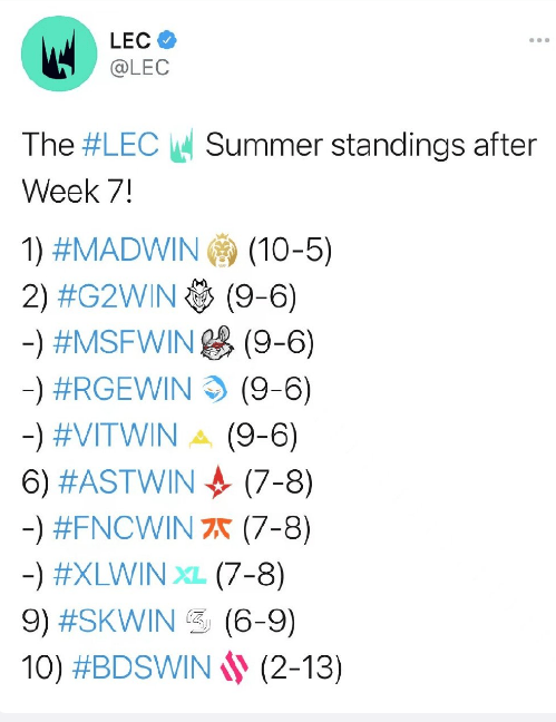 截止到LEC夏季赛第七周(8月7日)的比赛结束后,排名前五的队伍中有四队同分!可即便如此,包括G2、MSF、RGE以及VIT在内的四支胜场数相同的队伍,跟排名榜首的MAD也只有一个胜场差。