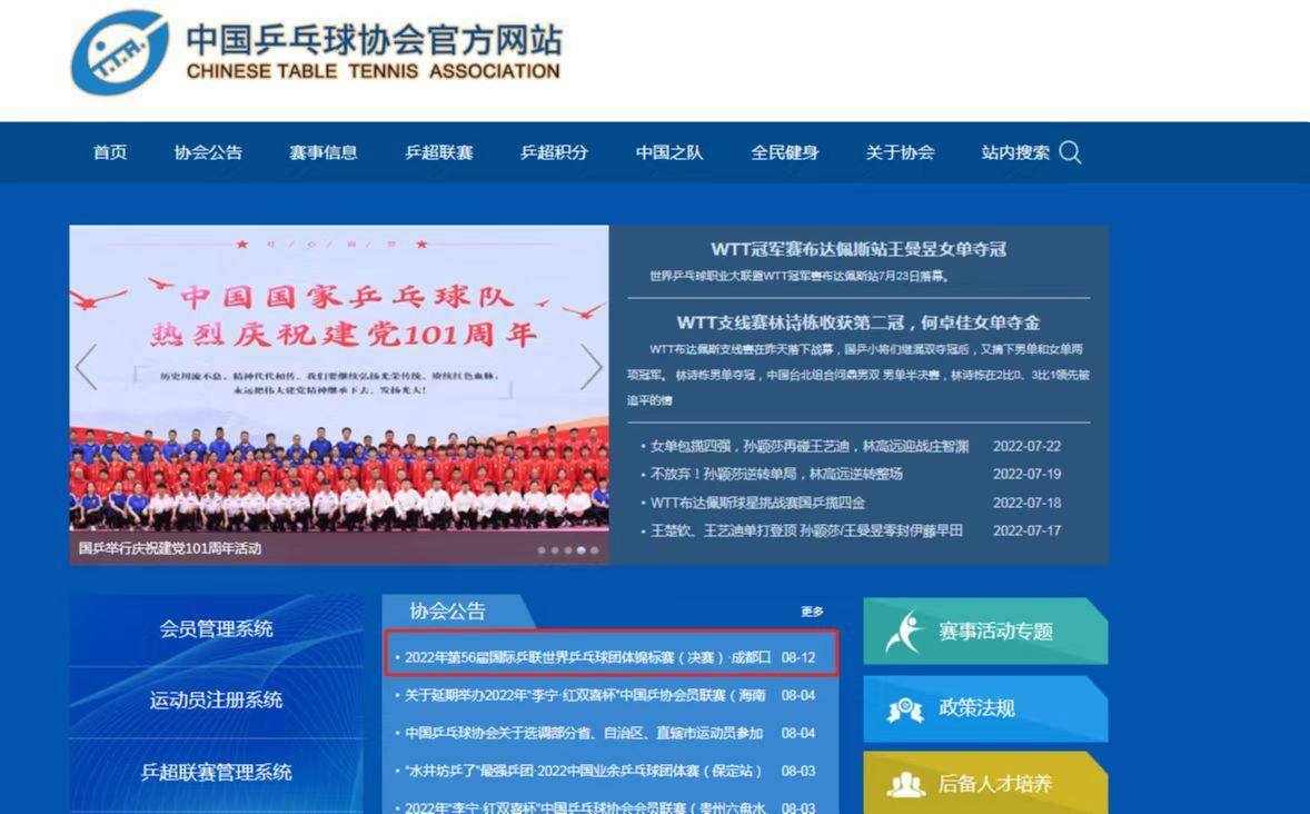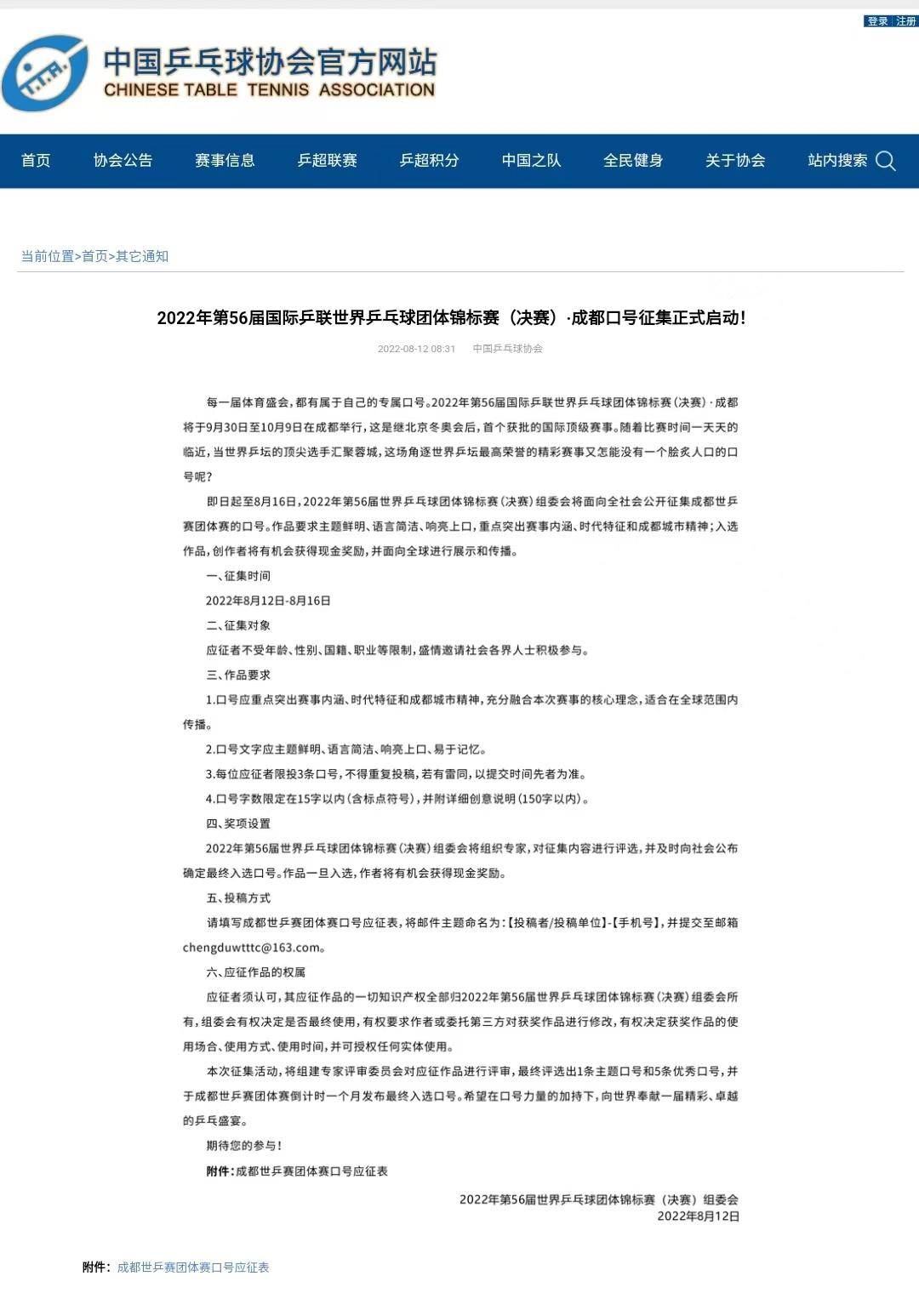 本次口号征集活动,将组建专家评审委员会对应征作品进行评审,最终评选出1条主题口号和5条优秀口号,并于成都世乒赛团体赛倒计时一个月发布最终入选口号。目前,口号征集公告及应征表已在中国乒协官方网站上(https://www.ctta.cn/xhgg/qttz/2022/0812/413401.html)发布。
