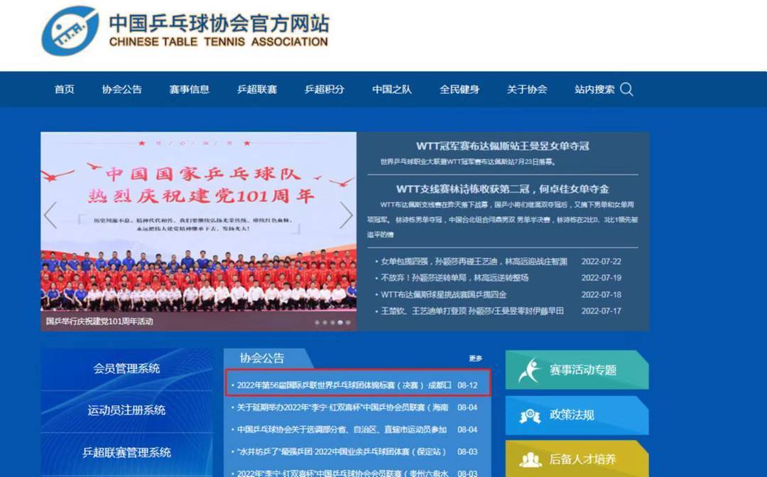 从8月12日起,至8月16日,2022年第56届世界乒乓球团体锦标赛(决赛)组委会将面向全社会公开征集成都世乒赛团体赛的口号。作品要求主题鲜明、语言简洁、响亮上口,重点突出赛事内涵、时代特征和成都城市精神;入选作品,创作者将有机会获得现金奖励,并面向全球进行展示和传播。