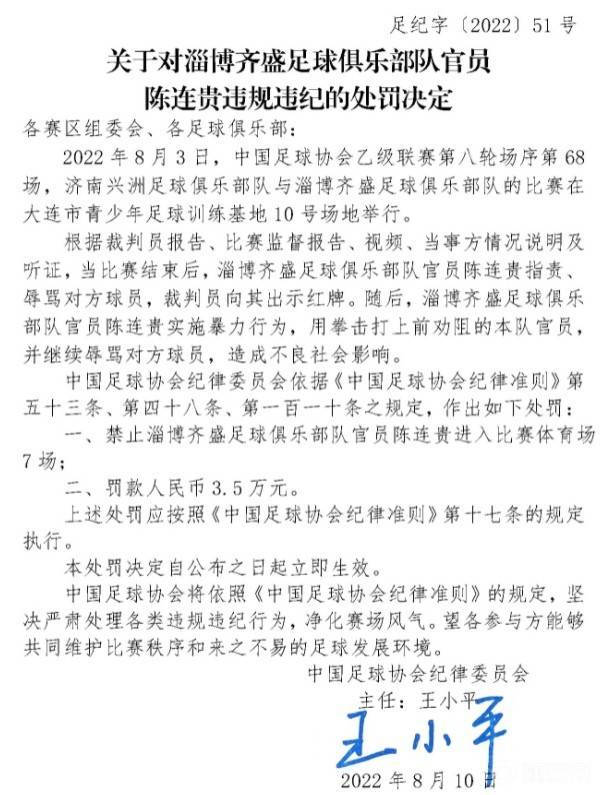 最终,足协就陈连贵的这一系列脱序行为对其处以了禁赛7场、罚款3.5万元的处罚。