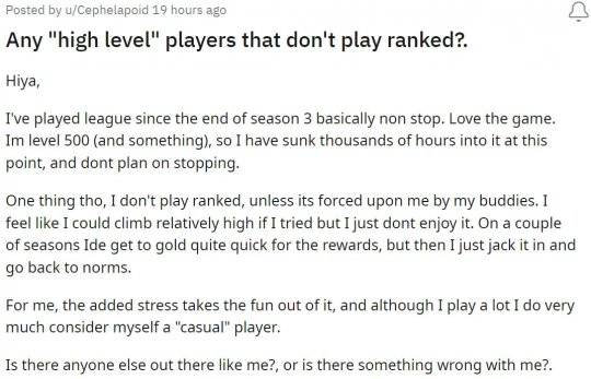 那么有没有不打排位,不追求段位的佛系玩家呢?答案当然是肯定的,并且这部分人还算少。最近在外网Reddit论坛上,就有一位自称玩了几千个小时的游戏,等级高达500级的玩家,寻找起了不打排位的同伴。