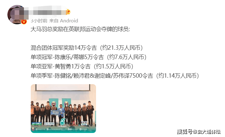 大马羽总奖励英联邦运动会获奖球员,相比国羽奥运获奖差多少?