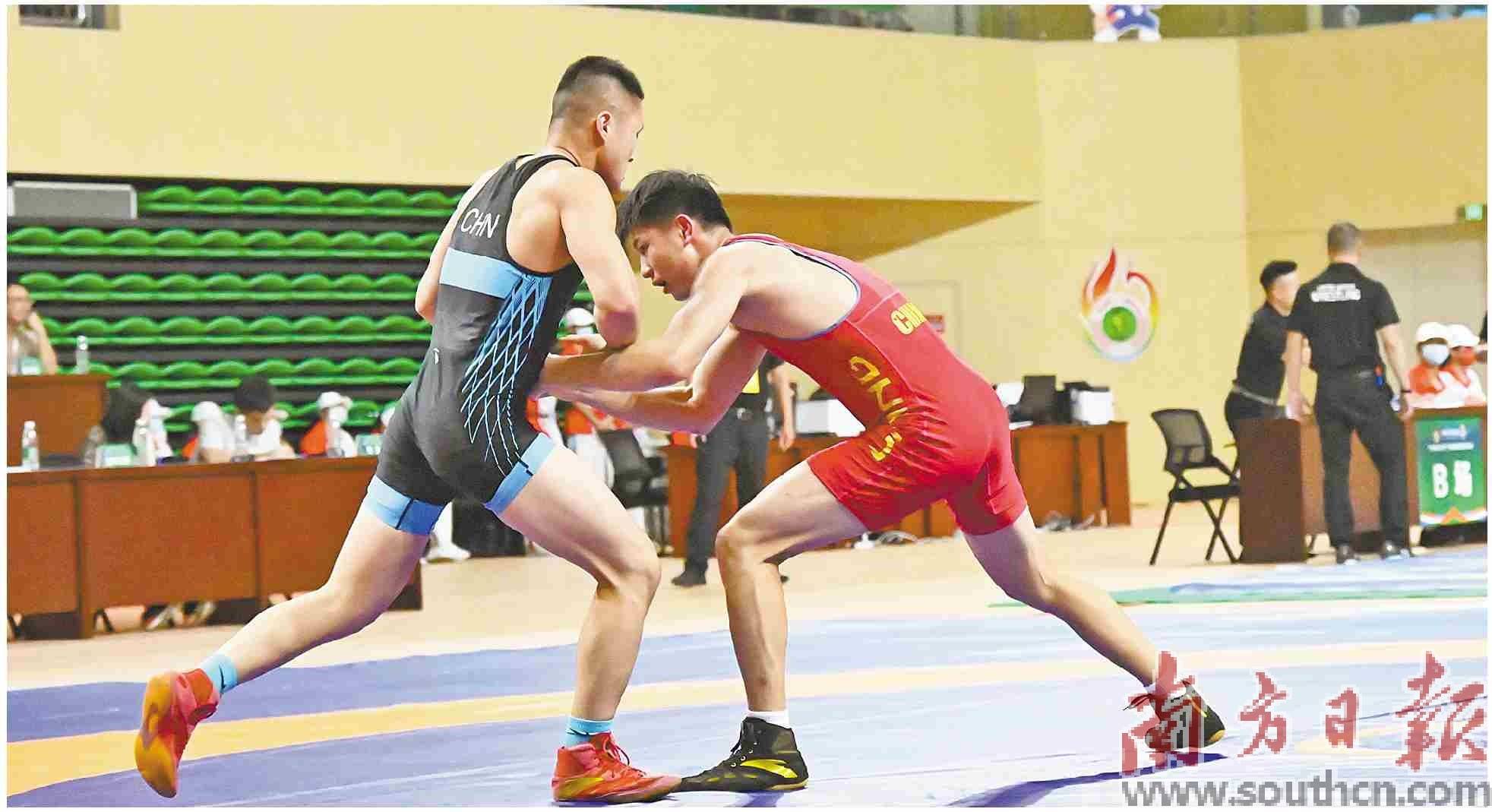 “往前,往前冲”“收低一点”“没时间了,还剩30秒”“加油”……赛场上,摔跤选手们徒手相搏,挥汗如雨;赛场边,教练高声呼喊,临场指挥;看台上,队友们加油助威,喝彩声不断——省运会摔跤比赛开赛首日,现场令人热血沸腾。