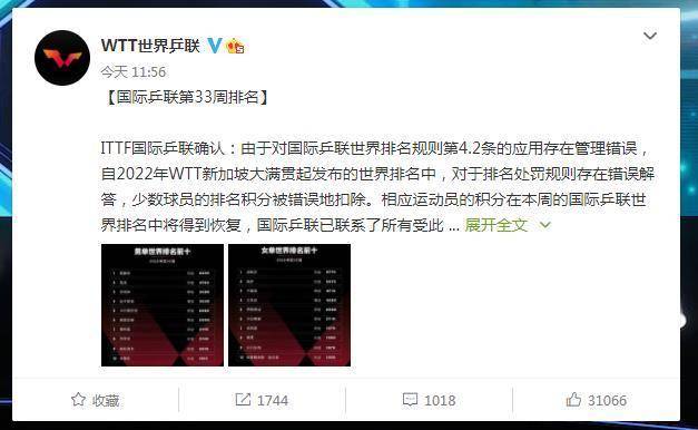 而在这期的排名中,国际乒联做出了专门的声明:“由于对国际乒联世界排名规则第4.2条的应用存在管理错误,自2022年WTT新加坡大满贯起发布的世界排名中,对于排名处罚规则存在错误解答,少数球员的排名积分被错误地扣除。相应运动员的积分在本周的国际乒联世界排名中将得到恢复,国际乒联已联系了所有受此影响的球员。”