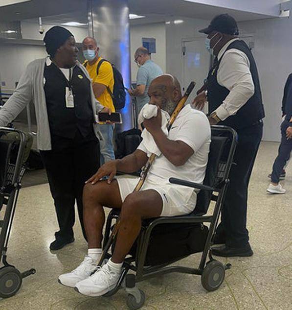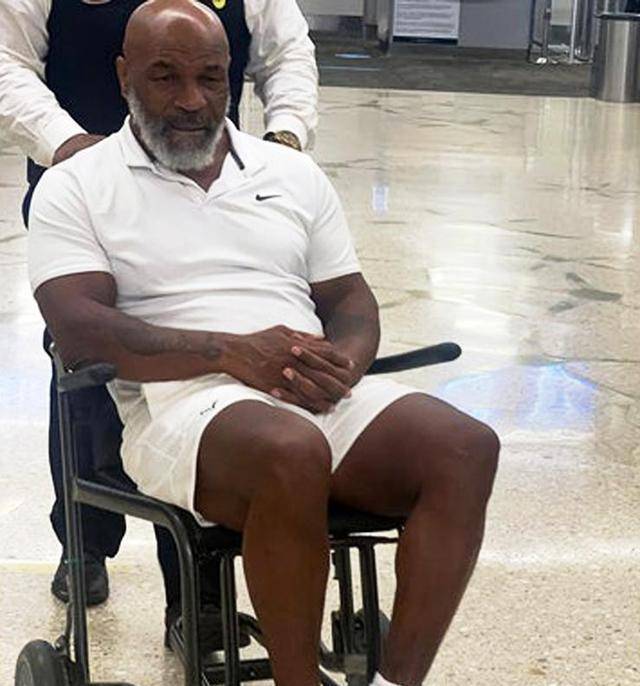 - >56岁的拳击冠军泰森身体状况堪忧,他现身机场,无法行走,只能坐轮椅